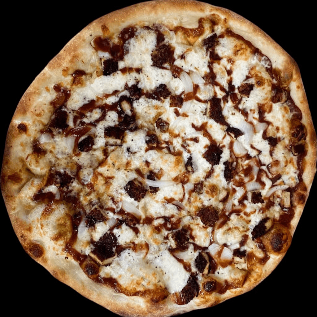 BBQ sauce, breaded chicken, onion, and cheese. We have only 10” cauliflower crust pizza.