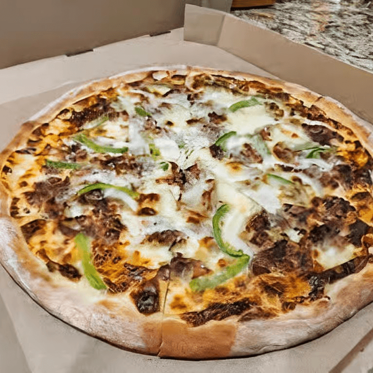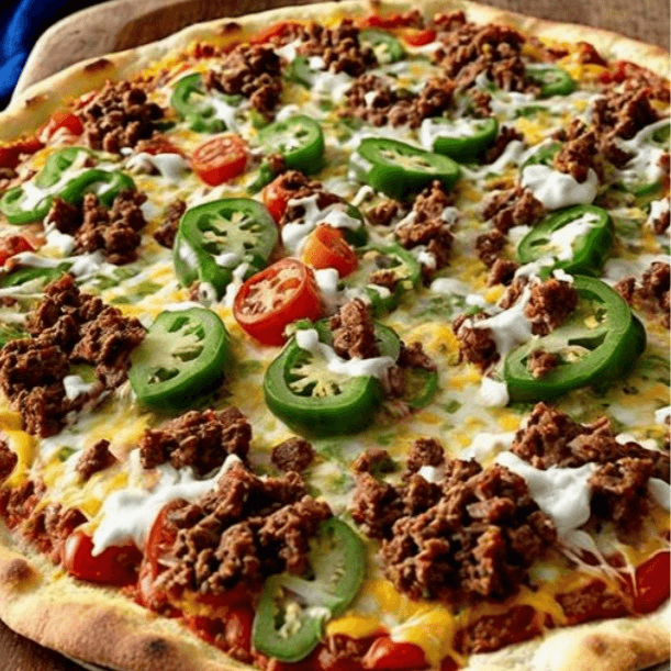 Steak, jalapeno, green pepper, onion, taco spice, Cheddar cheese, mozzarella. Square cut, 16 x 16 inch pizza