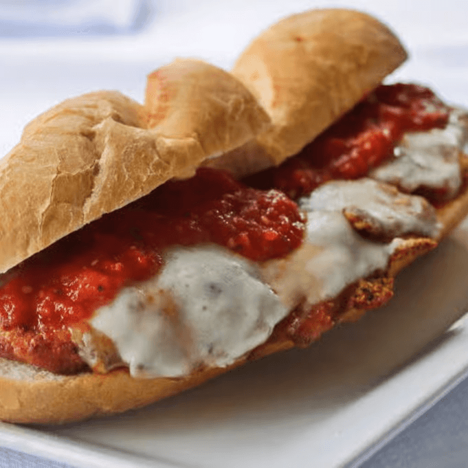 Grilled chicken topped with provolone or American cheese, sauteed onion, green pepper, and mushrooms, and served with a side of marinara sauce