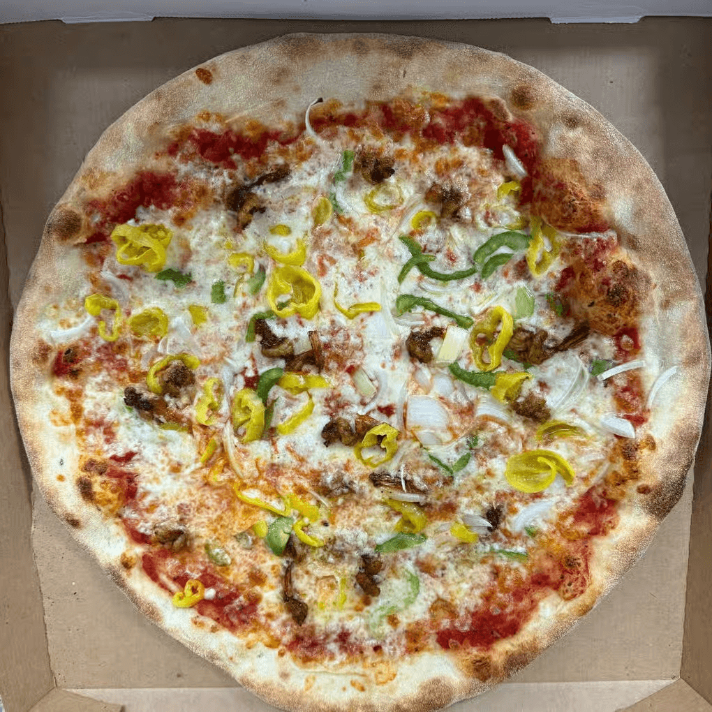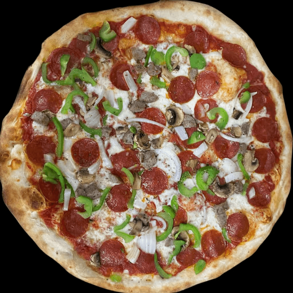 Pizza sauce, sausage, green pepper, onion, pepperoni, mushroom, and cheese. We have only 10” cauliflower crust pizza.