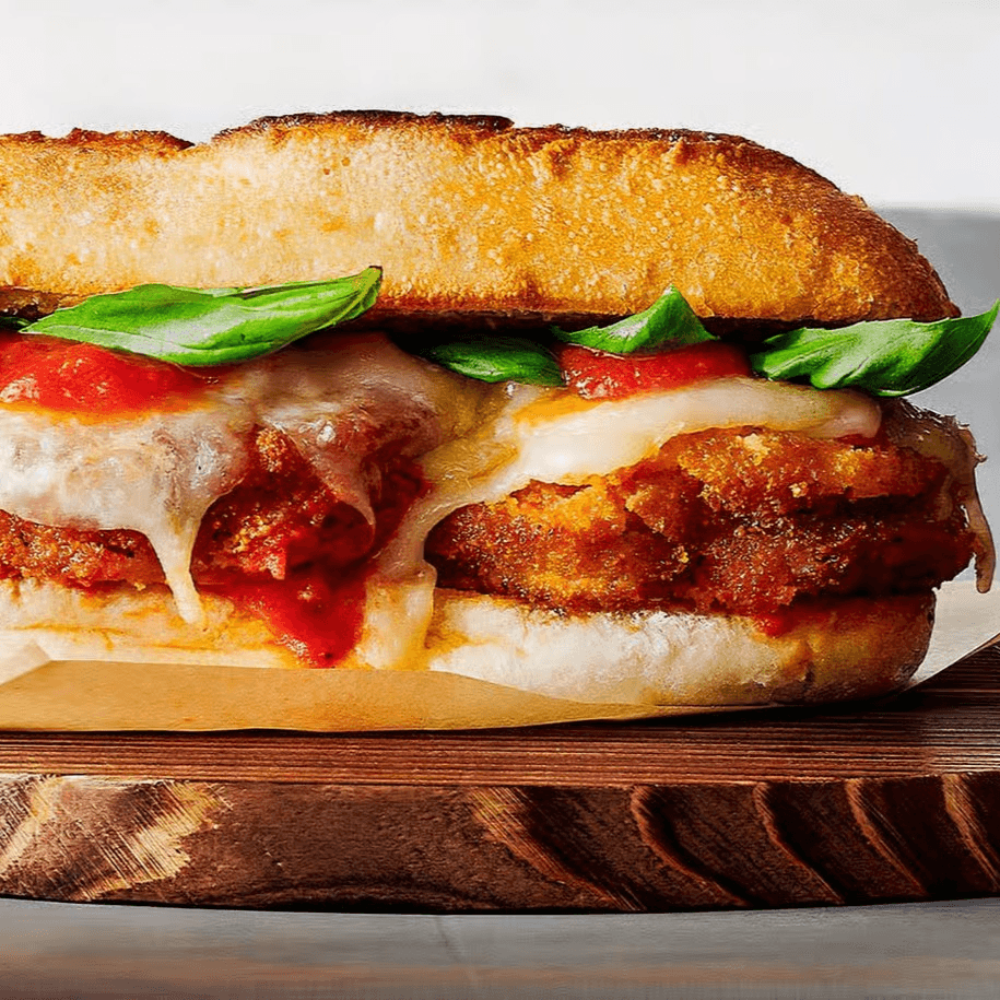 Lightly breaded chicken breast topped with marinara sauce and mozzarella cheese