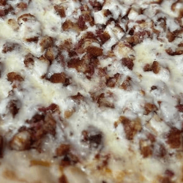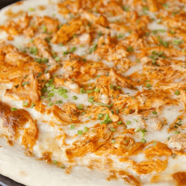 Buffalo sauce, breaded chicken, onion, and jalapeno peppers. Square cut, 16 x 16 inch pizza