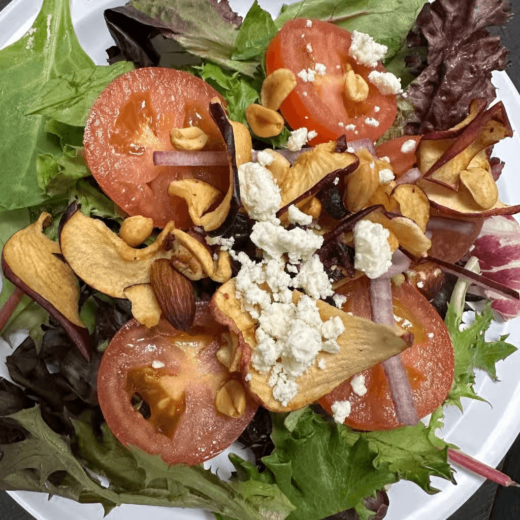 Spring mix, tomato, onion, feta cheese, apple chips, nuts, and cranberry