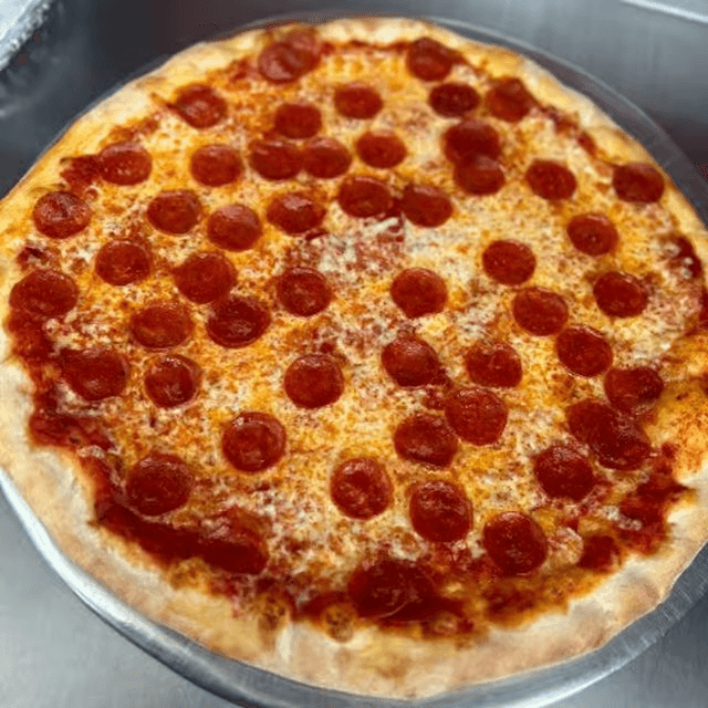 Pizza sauce, pepperoni, and mozzarella cheese. Square cut, 16 x 16 inch pizza