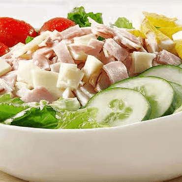Ham, turkey, cheese, and mixed greens with tomatoes, cucumbers, carrots, onions, and peppers