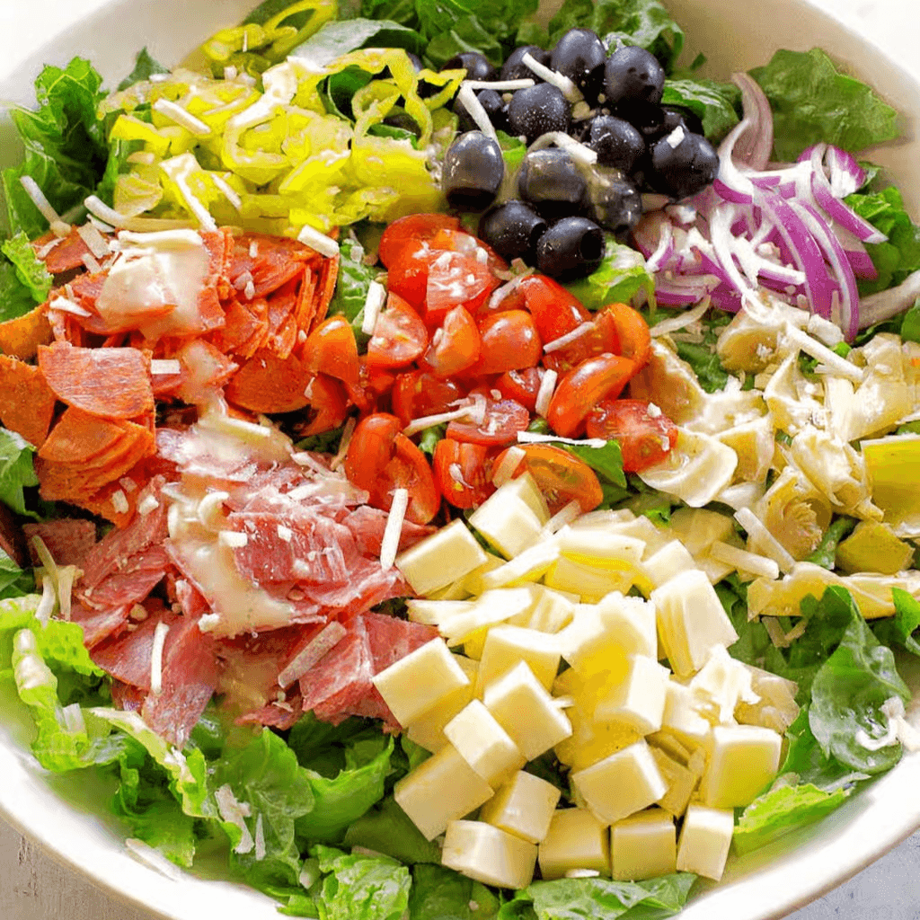 Mixed greens with onions, peppers, cucumbers, olives, tomatoes, pepperoni, cheese, and salami, with Italian dressing