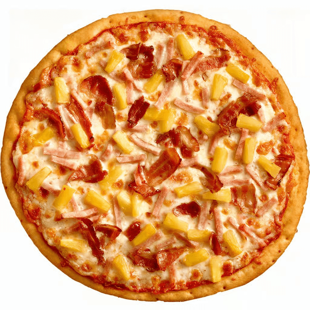 Pizza sauce, pineapple, ham, and cheese. Square cut, 16 x 16 inch pizza