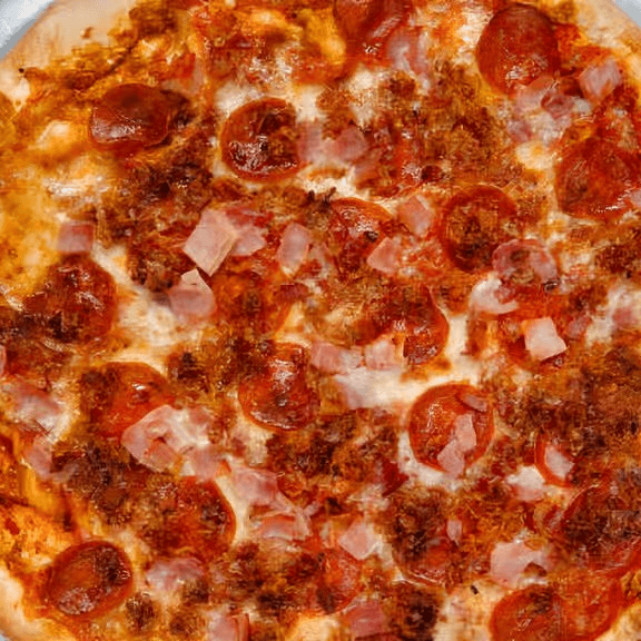 Pizza sauce, pepperoni, sausage, ham, bacon, and meatball. We have only 10” cauliflower crust pizza.