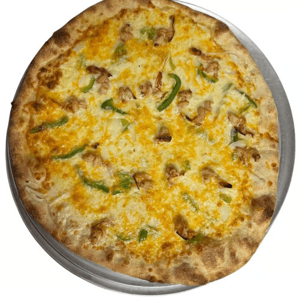 Buffalo sauce, breaded chicken, onion, and jalapeno peppers. We have only 10” cauliflower crust pizza.