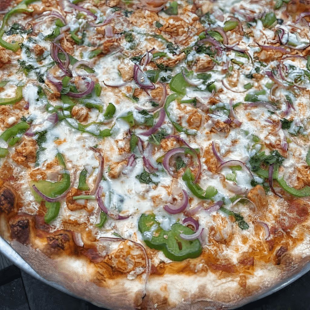 Butter chicken sauce, chicken marinated in sauce, green pepper, onion, ginger, and cilantro. Square cut, 16 x 16 inch pizza