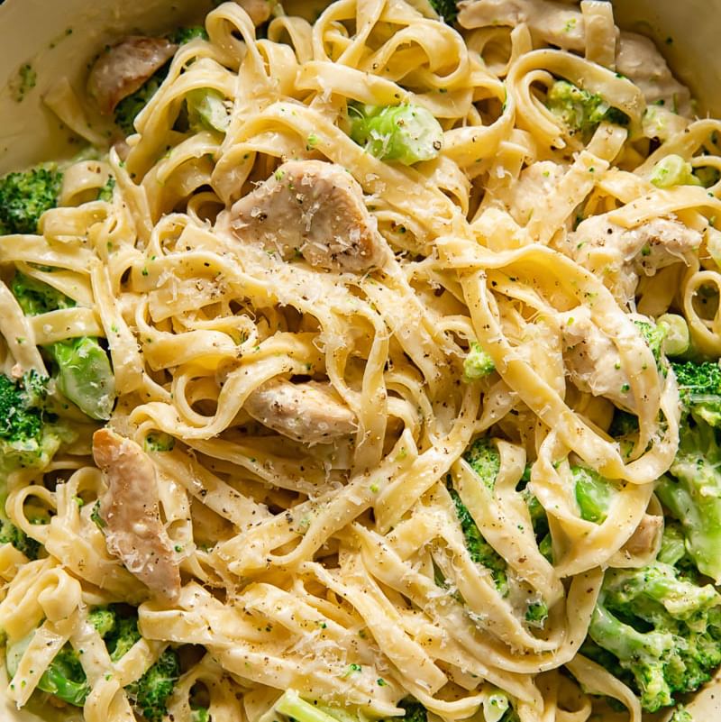 Fettuccine pasta in creamy alfredo sauce, tossed with chicken and broccoli